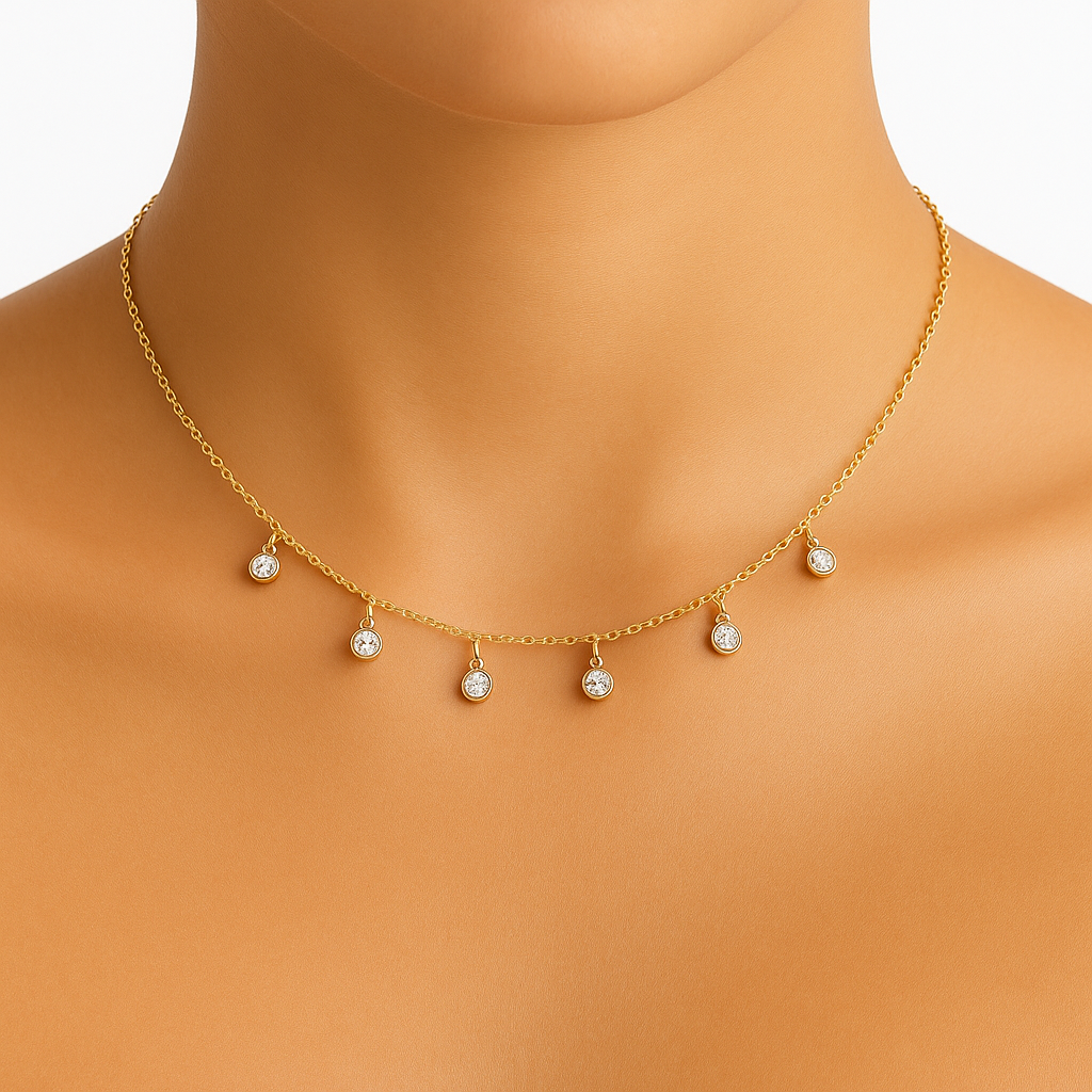 Un collier raffiné en acier inoxydable doré, orné de cinq pendentifs sertis de zirconiums étincelants. Un bijou lumineux et intemporel, parfait pour apporter une touche d’élégance à toutes vos tenues.